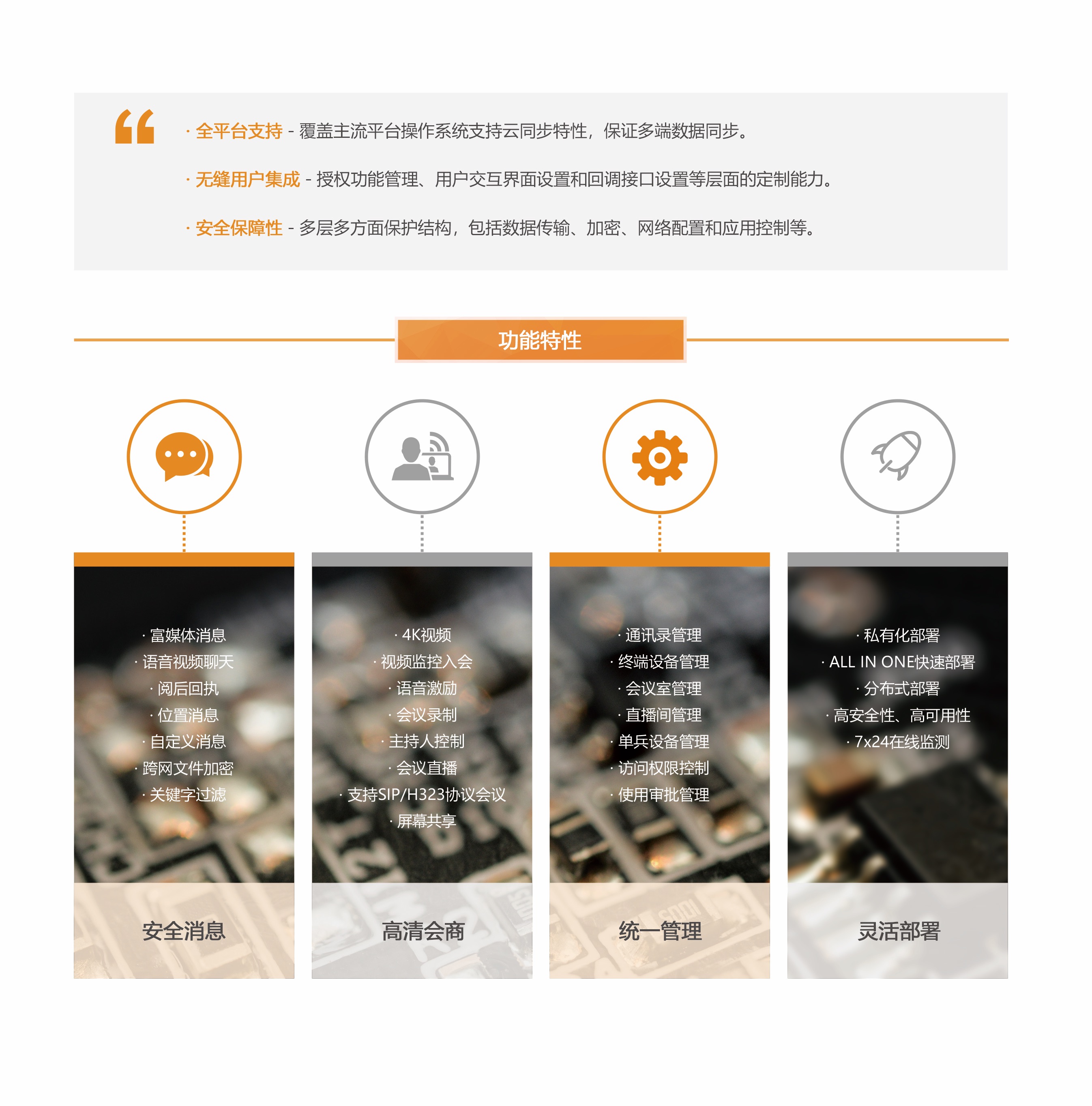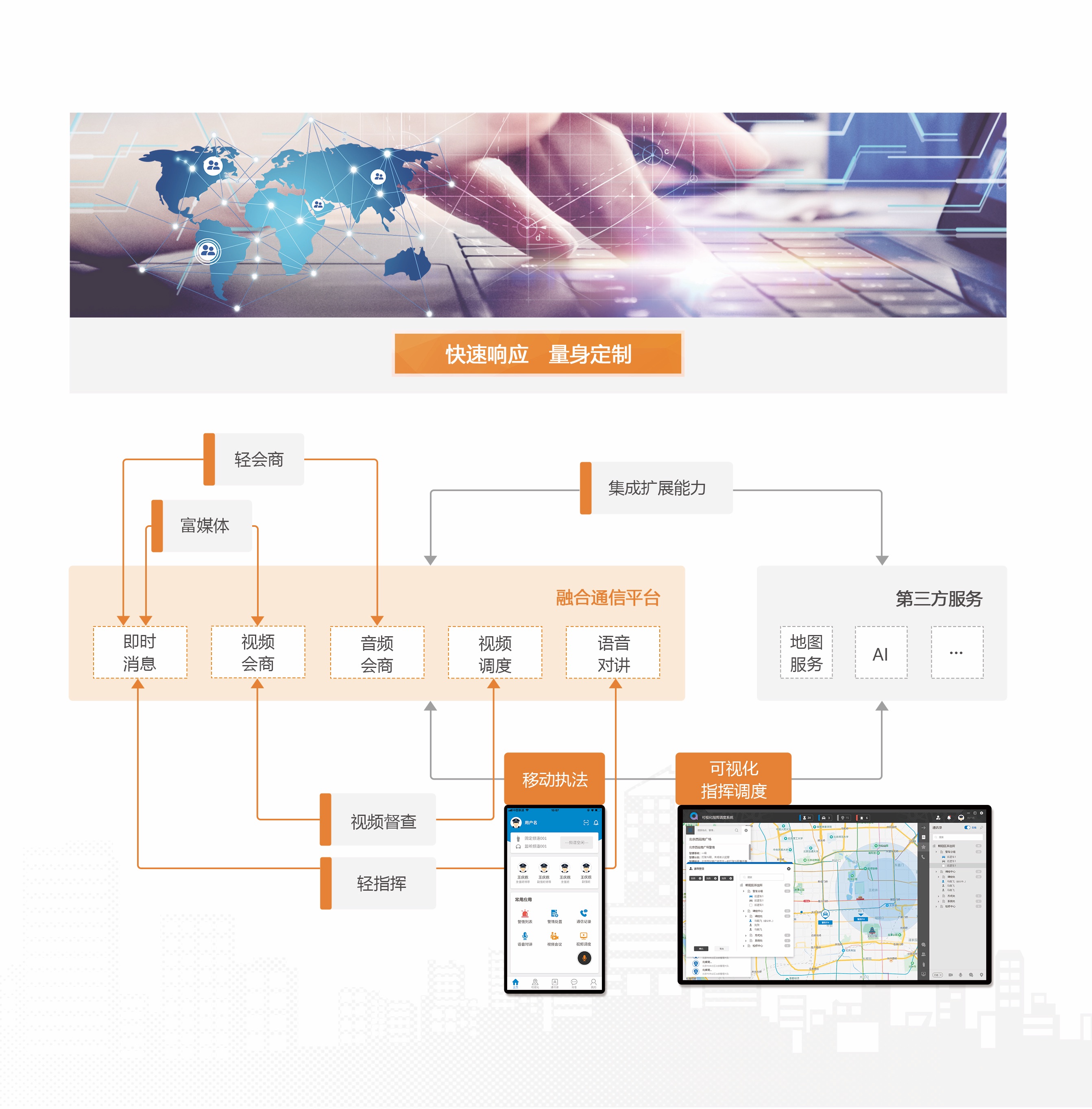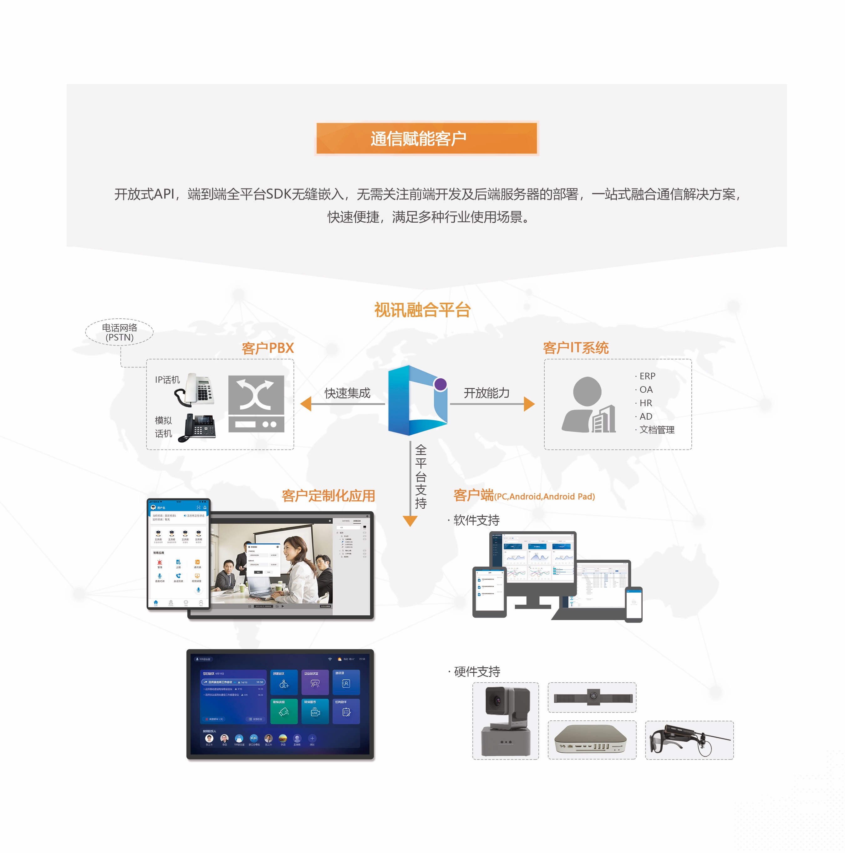 視訊融合平臺(tái)采用云架構(gòu)設(shè)計(jì)理念,使用多種核心技術(shù)優(yōu)化移動(dòng)網(wǎng)絡(luò)下音視頻傳輸,保障用戶在波動(dòng)的網(wǎng)絡(luò)環(huán)境下也能達(dá)到最佳的音視頻交互體驗(yàn)。平臺(tái)支持視頻會(huì)議、即時(shí)消息、監(jiān)控調(diào)度、視頻圖傳、可視化地圖等多種功能,提升了用戶協(xié)作;支持桌面終端、移動(dòng)終端、智能視訊終端等多種類(lèi)型終端接入,保障用戶任意時(shí)間、任意地點(diǎn)、任意方式,都可以享受到高品質(zhì)的通信服務(wù)。 平臺(tái)具備超大容量、多形態(tài)部署、多種通信模式、靈活權(quán)限控制、統(tǒng)一通訊錄集成等特性,同時(shí)還通過(guò)開(kāi)放式接口,提供強(qiáng)大的用戶定制功能,滿足多種行業(yè)使用場(chǎng)景。
